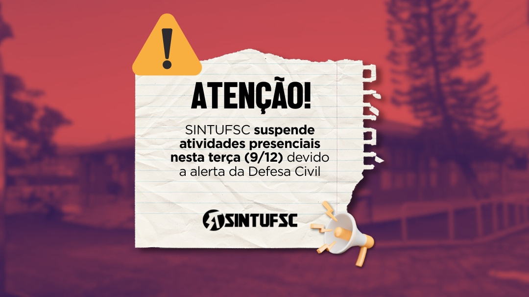 Estão suspensas as atividades presenciais na sede do SINTUFSC nesta terça-feira, 9 de dezembro, devido à previsão do tempo para a data e à emissão de alerta vermelho pela Defesa Civil de Santa Catarina. Os atendimentos serão realizados somente por