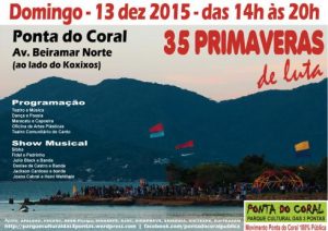 O Movimento Ponta do Coral 100% Pública, da luta ambiental, cultural e do direito à cidade com vida digna para todos está convidando a comunidade de Florianópolis para o ATO 35 PRIMAVERAS EM DEFESA DA PONTA DO CORAL 100% PÚBLICA, que será realizado no domingo, dia 13 de dezembro, das 14