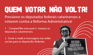 O SINTUFSC convoca trabalhadores da UFSC a participarem da reunião de mobilização nesta quinta-feira (21/10), às 14 horas, para organizarmos as próximas ações contra a PEC 32. O Sindicato junto com o Fórum de Servidores Públicos de Santa Catarina participa de uma Jornada de Lutas em Brasília e nessa reunião