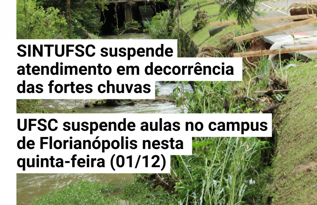 Diante das fortes chuvas que estão ocorrendo em várias regiões de Santa Catarina, dos alertas emitidos pela Defesa Civil reportando deslizamentos, alagamentos e chuva volumosa, bem como, ainda, a ocorrência de alagamentos em alguns setores da UFSC e problemas na estrutura do SINTUFSC, a Diretoria informa que está suspenso o expediente no período da manhã […]