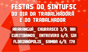 O Dia da Trabalhadora e do Trabalhador, 1 º de maio, é dia de ocupar as ruas em defesa dos direitos, mas essa é também uma data para comemorarmos nossa luta e conquistas coletivas. Na primeira semana de maio, o Sintufsc convida filiadas e filiados para festas em Araranguá, Curitibanos