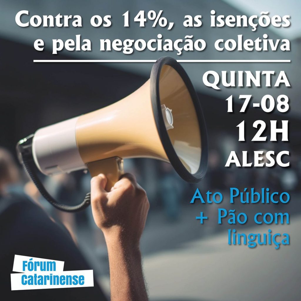 O Fórum Catarinense de Defesa do Serviço Público convoca servidores e servidoras para um ato unificado nesta quinta-feira, 17, a partir das 10h, em frente à Alesc, contra o desconto de 14% dos aposentados no estado, as isenções e pela negociação coletiva. A apresentação cultural começará às 10 horas, o pão com linguiça será servido […]