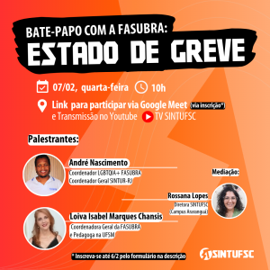 O SINTUFSC convida servidores técnico-administrativos da UFSC a participar do Bate-Papo Online com a Fasubra: Estado de Greve, nesta quarta-feira, 7/2, às 10h. A roda de conversa será online no Google Meet, o link de acesso será enviado por meio de inscrição prévia, e também terá transmissão no canal do