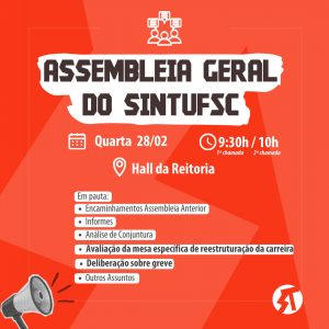 O SINTUFSC convoca todas, todos e todes servidores técnico-administrativos em Educação da UFSC para Assembleia Geral Extraordinária, na próxima quarta-feira, 28, de forma presencial no Hall da Reitoria do Campus Trindade/UFSC e com participação online via Google Meet para os demais Campi, com primeira convocação às 9h30 e segunda convocação