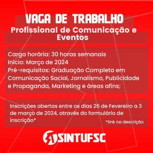 EDITAL PARA CONTRATAÇÃO IMEDIATA DE PROFISSIONAL DE COMUNICAÇÃO E EVENTOS O SINTUFSC – Sindicato de Trabalhadores em Educação das Instituições Públicas de Ensino Superior do Estado de Santa Catarina – realiza processo de seleção através do EDITAL DE SELEÇÃO 00X/2024 para contratação imediata, de acordo com as normas regidas pelo