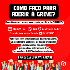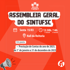 O SINTUFSC convoca trabalhadores e trabalhadoras da UFSC para Assembleia Geral de Prestação de Contas, que será no dia 15 de março, sexta-feira, no Hall da Reitoria da UFSC, em primeira convocação às 13h30, com a presença de 50% mais um dos trabalhadores da UFSC, e às 14h em segunda
