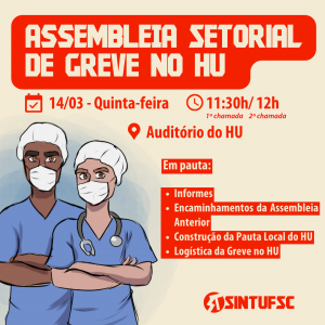 O SINTUFSC convoca trabalhadoras e trabalhadores do Hospital Universitário (HU/UFSC) para Assembleia Setorial de Greve no HU, nesta quinta-feira, 14, com primeira chamada às 11h30 e segunda chamada às 12h. Em pauta: Informes Encaminhamentos da Assembleia Anterior Construção da Pauta Local do HU Logística da Greve no HU Acesse aqui