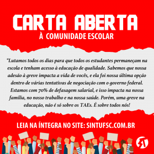 Nós, trabalhadores técnico-administrativos em educação (TAE ́s) do Colégio de Aplicação (CA), no dia 11 de março, iniciamos uma greve por tempo indeterminado, junto com nossos colegas da UFSC e das universidades federais de todo o Brasil. Atualmente, no CA da UFSC, contamos com o trabalho de 58 profissionais técnicos,