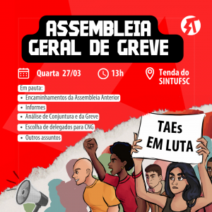 O SINTUFSC convoca os trabalhadores e trabalhadoras da UFSC para participarem da Assembleia Geral de Greve, a ser realizada no dia 27 de março de 2024, quarta-feira, em tenda localizada em frente à Reitoria da UFSC, em primeira convocação às 13h, com a presença de 50% mais um dos trabalhadores