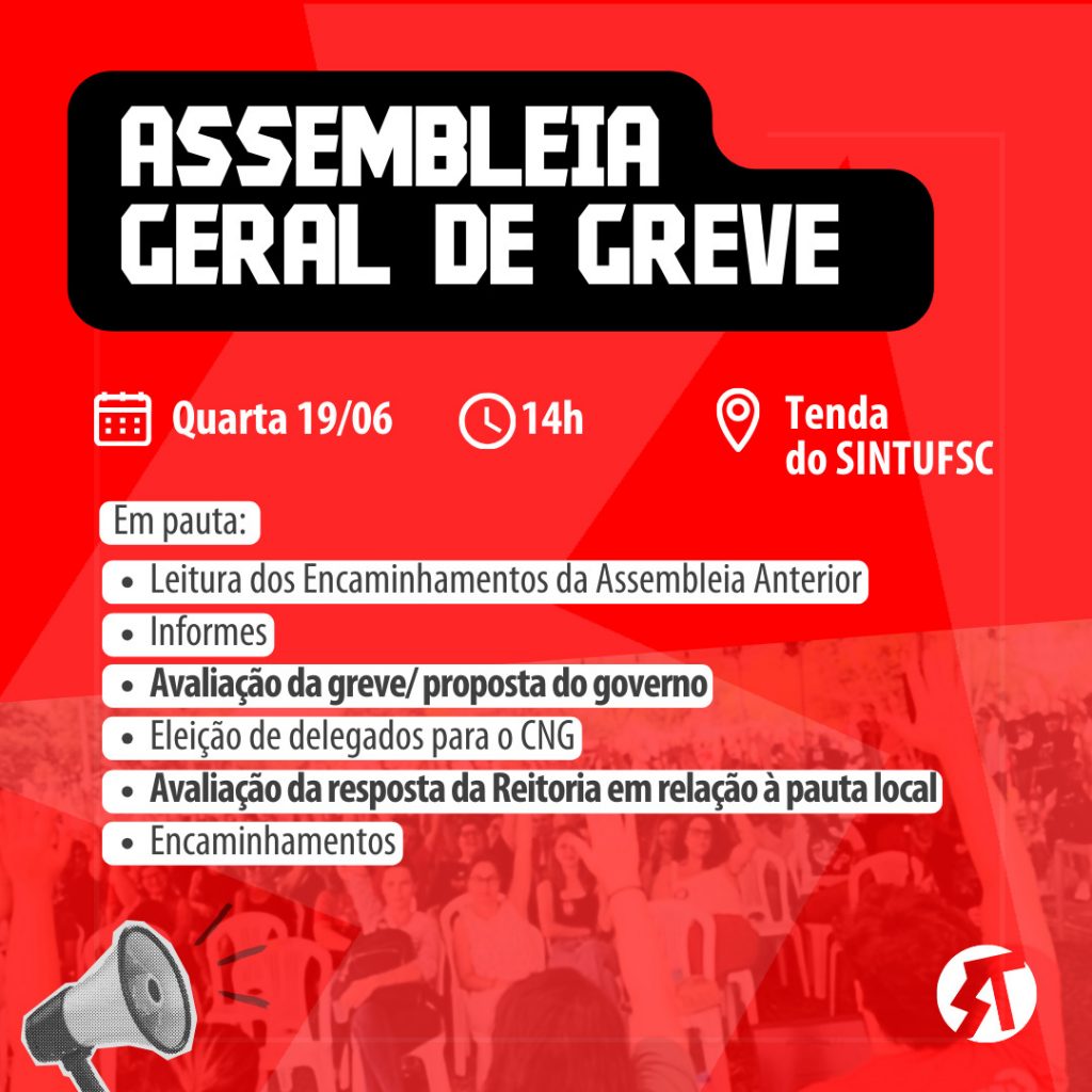 O Comando de Greve convoca trabalhadores e trabalhadoras da UFSC para Assembleia Geral de Greve, nesta quarta-feira, 19, presencialmente na tenda do SINTUFSC em frente à Reitoria e participação online dos Campi às 14h.