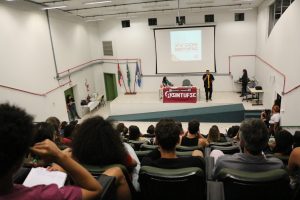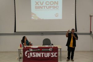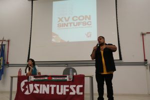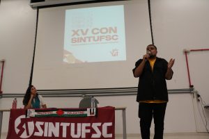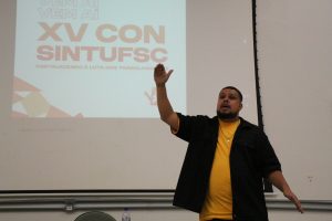 O XV CONSINTUFSC teve início nesta segunda-feira, 25, com a conferência “Capitalismo no Brasil Hoje e as Transformações no Mundo do Trabalho”, com Paulo Galo – militante de movimentos sociais e líder do movimento Entregadores Antifascistas. O congresso é espaço máximo de deliberação do SINTUFSC, onde trabalhadores técnico-administrativos da UFSC se reúnem para debater e definir os rumos do sindicato e das lutas da categoria.