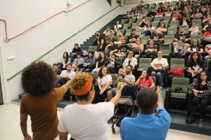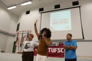 O evento teve início com a apresentação de poesias do grupo Slam Cruz & Souza e foi conduzido pela diretora do SINTUFSC, Juliane Pasqualeto.