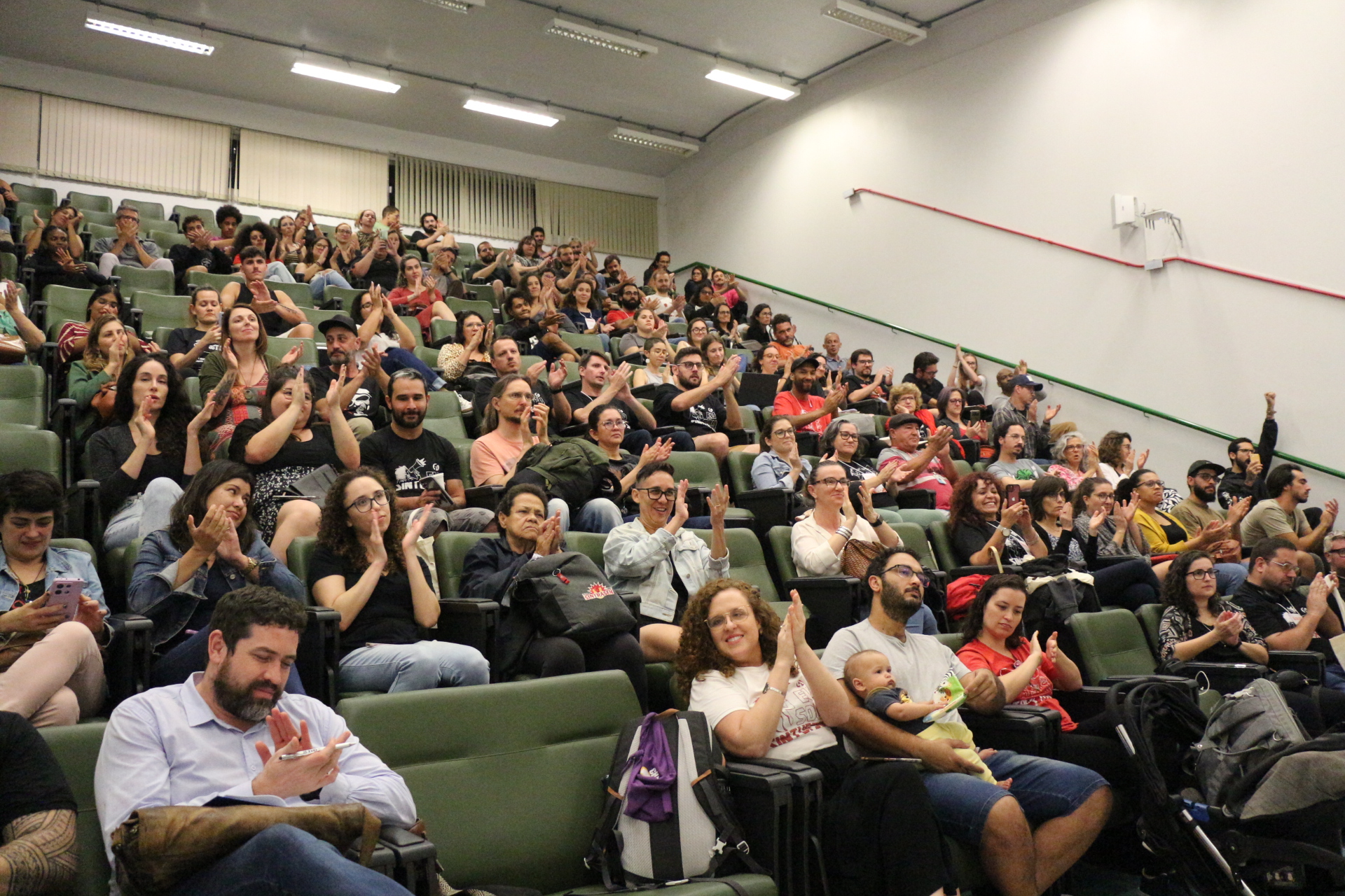 O evento teve início com a apresentação de poesias do grupo Slam Cruz & Souza e foi conduzido pela diretora do SINTUFSC, Juliane Pasqualeto.