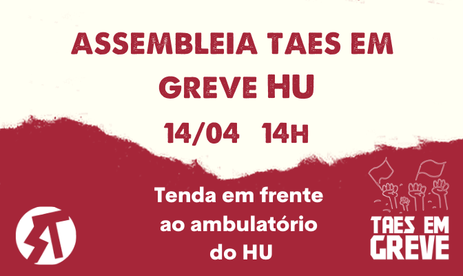 Participe da ASSEMBLEIA TAES EM GREVE no HU/UFSC na quinta-feira (14 de abril de 2022), às 14h. A assembleia ocorrerá na Tenda em frente ao ambulatório do HU.