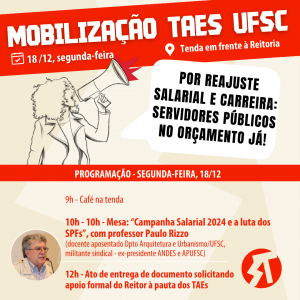 Convocamos trabalhadores da UFSC a participar da mobilização na próxima segunda-feira, 18, a partir das 9h. Teremos uma Tenda em frente à Reitoria, com café da manhã e debate com a mesa “Campanha Salarial 2024 e a luta dos SPFs”, com professor Paulo Rizzo. Às 12h, teremos o Ato de entrega de documento solicitando
