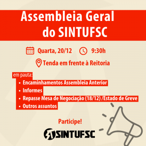 E na quarta-feira, 20, teremos Assembleia Geral Extraordinária, com 1ª chamada às 9h30 e 2ª às 10h, também na Tenda em frente à Reitoria. Em pauta: Encaminhamentos da Assembleia Anterior, Informes, Retorno sobre a Mesa de Negociação (18/12)/Estado de Greve e Outros Assuntos.