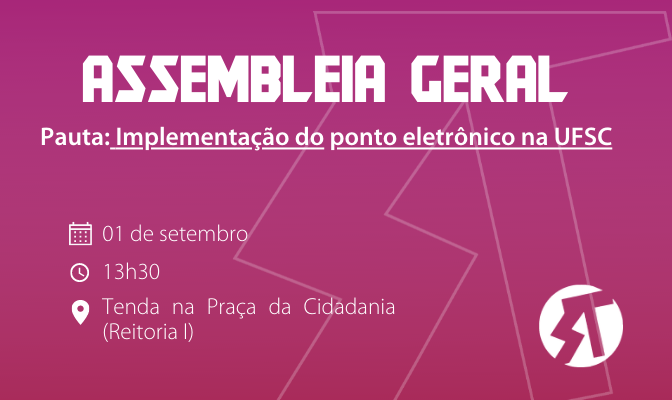 Assembleia Geral sobre Implementação do ponto eletrônico na UFSC e outros assuntos O Sindicato de Trabahadores em Educação da Universidade Federal de Santa Catarina (SINTUFSC), na forma estatutária convoca Assembleia Geral Extraordinária, a ser realizada no dia 01 de setembro de 2022, quinta-feira, na Tenda da Praça da Cidadania (em Frente à Reitoria I), em primeira […]
