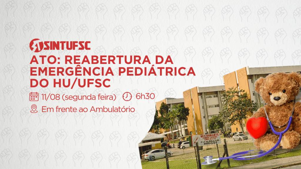 Vitória da luta coletiva! Depois de quase 1 ANO de portas fechadas, a EBSERH anunciou a reabertura da Emergência Pediátrica do HU-UFSC para esta segunda-feira, 11/08. Mas que fique claro: essa reabertura NÃO É UM PRESENTE DA EBSERH. Foi a mobilização da comunidade universitária, com pressão expressiva do SINTUFSC desde setembro de 2024, que garantiu […]