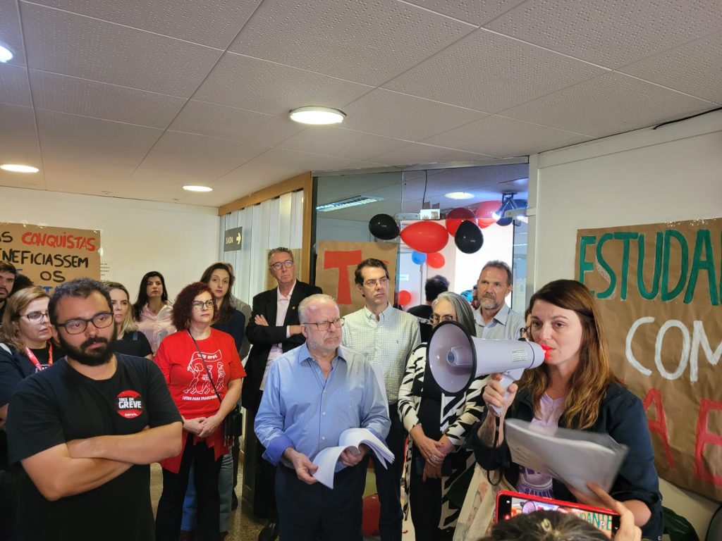 TAEs em greve na UFSC entregam pauta local de reivindicações ao reitor e exigem: #ForaSpyros