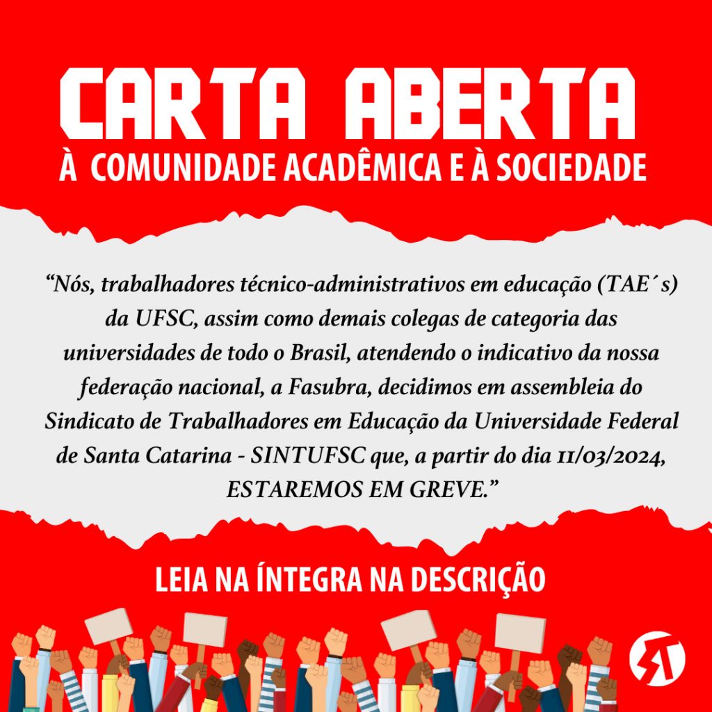CARTA ABERTA À COMUNIDADE ACADÊMICA E À SOCIEDADE Nós, trabalhadores técnico-adminis-trativos em educação (TAE´s) da UFSC, assim como demais colegas de categorias das universidades de todo o Brasil, atendendo o indicativo da nossa federação nacional, a Fasubra, decidimos em assembleia do Sindicato de Trabalhadores em Educação da Universidade Federal de Santa Catarina – SINTUFSC que, a […]