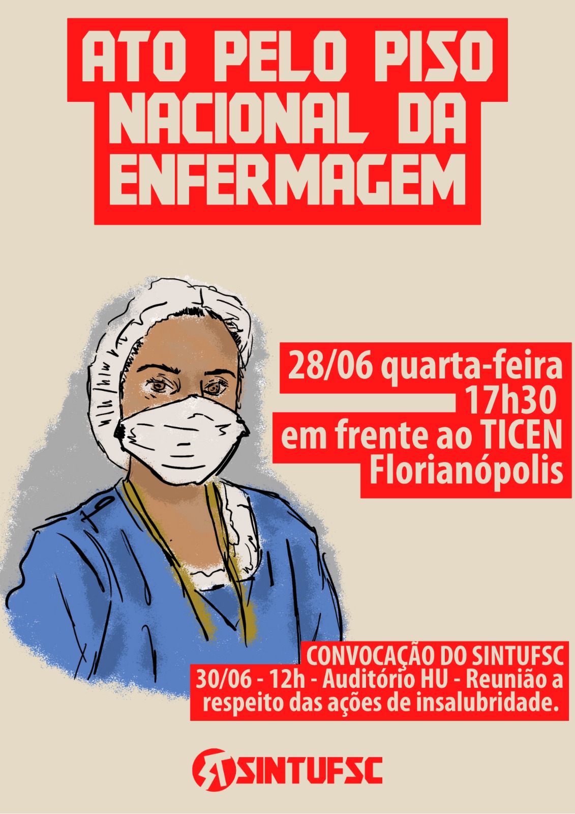 E nesta quarta-feira, 28, temos Ato Unificado pelo Piso Nacional na Enfermagem. A concentração será às 17h30, em frente ao Ticen.