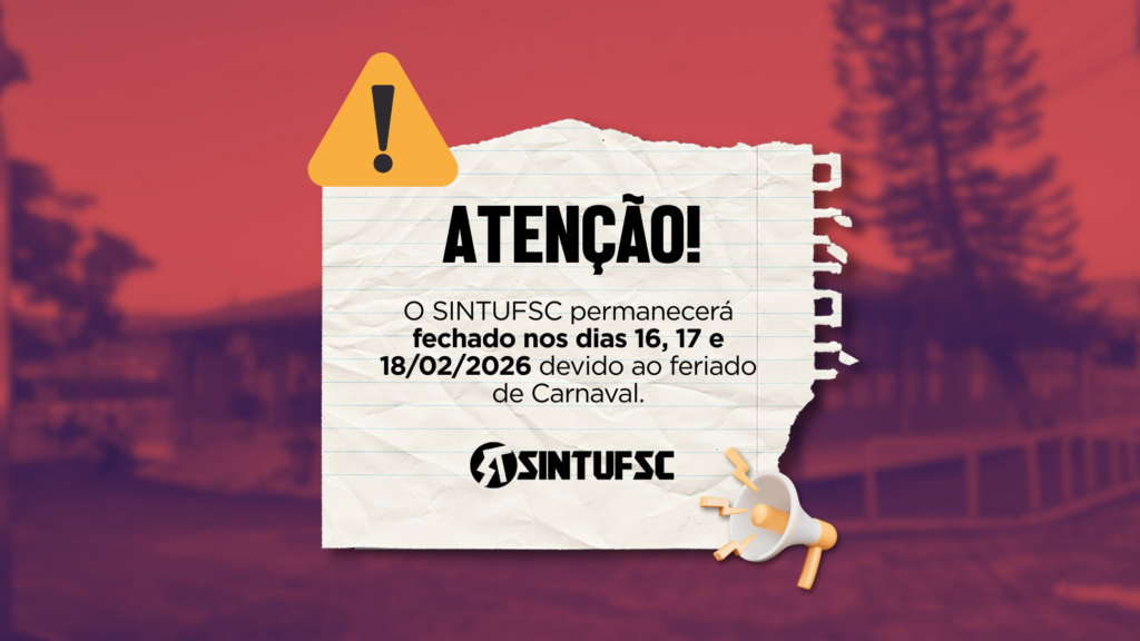 O SINTUFSC estará fechado segunda, terça e quarta-feira, dias 16, 17 e 18 de fevereiro, devido ao feriado de Carnaval e Quarta-Feira de Cinzas, conforme o calendário da UFSC.