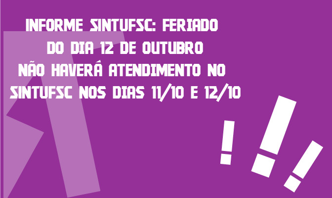 O SINTUFSC informa aos seus filiados que irá suspender as atividades do Sindicato nos dias 11/10 e 12/10.