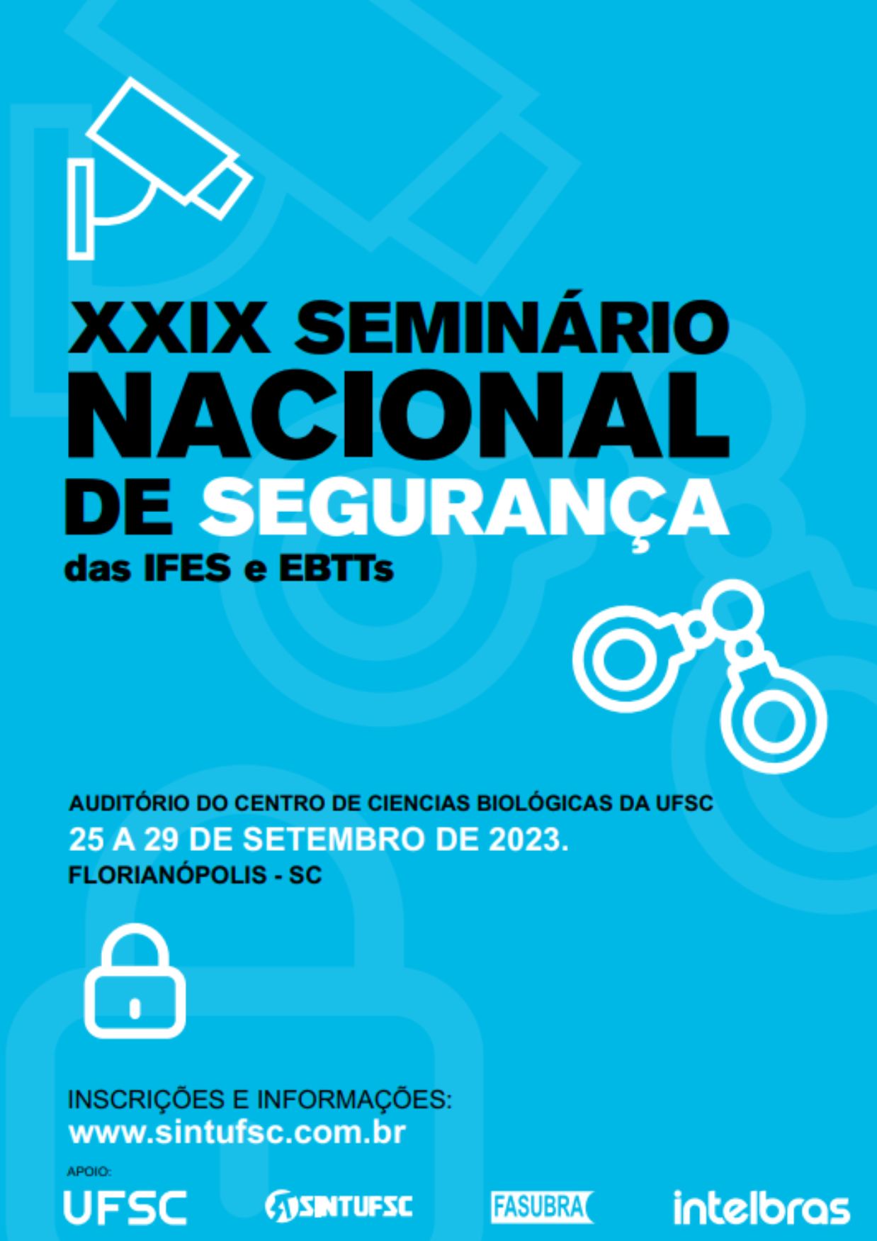 Estão abertas as inscrições para o XXIX Seminário Nacional de Segurança das Universidades Públicas e Institutos Federais (IFES e EBTTs), que ocorrerá de 25 a 29 de setembro, na UFSC, em Florianópolis (SC).