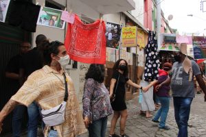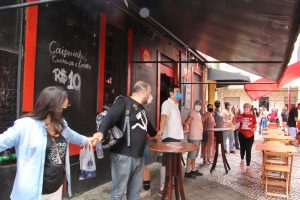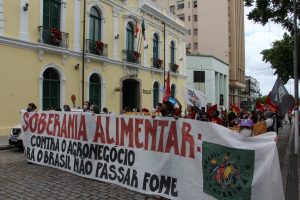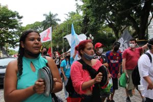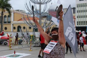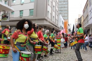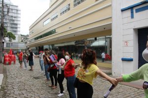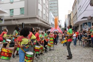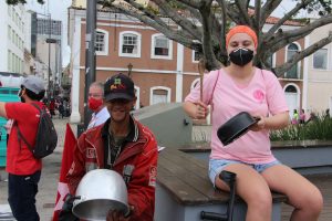 Com panelas, cartazes e tambores em mãos os manifestantes dialogaram com os trabalhadores do comércio do centro de Florianópolis e com pessoas que passavam pelo ato.