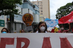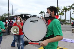 O SINTUFSC esteve presente no ato reiterando a importância de lutar contra a Reforma Administrativa (PEC 32) para a defesa dos serviços públicos.