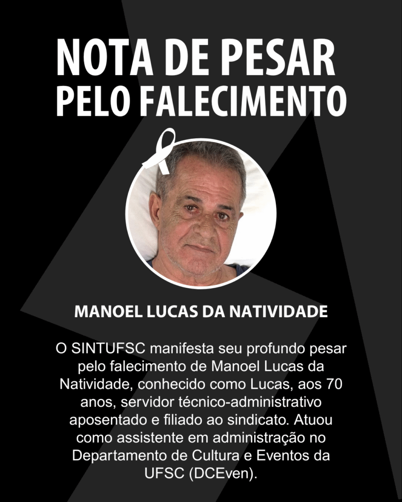 O SINTUFSC manifesta seu profundo pesar pelo falecimento de Manoel Lucas da Natividade, conhecido como Lucas, aos 70 anos, servidor técnico-administrativo aposentado e filiado ao sindicato. Atuou como assistente em administração no Departamento de Cultura e Eventos da UFSC (DCEven).