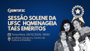 Convidamos todas e todos os técnicos-administrativos em educação (TAEs) a prestigiar a sessão solene da Universidade Federal de Santa Catarina (UFSC), que celebra seus 65 anos de existência. A cerimônia contará com programação cultural e com a entrega, pela primeira vez na instituição, de homenagens a quatro TAEs: Helena Olinda