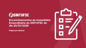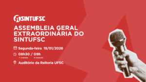 O Sindicato dos Trabalhadores em Educação da Universidade Federal de Santa Catarina – SINTUFSC, na forma estatutária, convoca os trabalhadores da Universidade Federal de Santa Catarina para participarem da Assembleia Geral Extraordinária, a ser realizada no dia 19 de janeiro de 2026, segunda-feira, no Auditório do Reitoria da UFSC, em