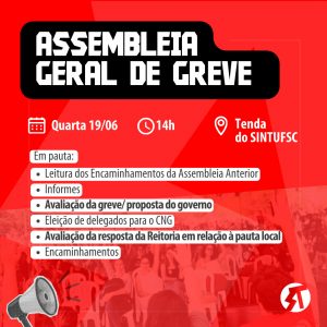 O Comando de Greve convoca trabalhadores e trabalhadoras da UFSC para Assembleia Geral de Greve, nesta quarta-feira, 19, presencialmente na tenda do SINTUFSC em frente à Reitoria e participação online dos Campi às 14h. Em pauta: 1- Leitura encaminhamentos 2- Informes 3- Avaliação da greve/Proposta do governo 4- Eleição de