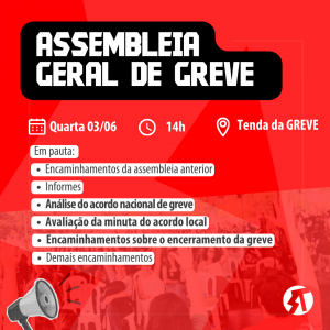 O Comando de Greve convoca Assembleia Geral de Greve para avaliar proposta do governo nesta quarta-feira, 03