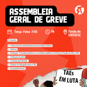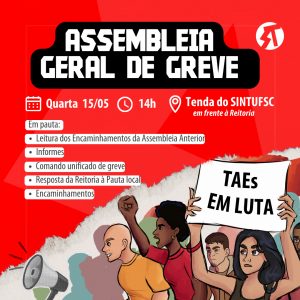 O SINTUFSC convoca trabalhadores e trabalhadoras da UFSC para Assembleia Geral de Greve, nesta terça-feira, 7, presencialmente na tenda do SINTUFSC em frente à Reitoria e participação online dos Campi às 9h. Em pauta: 1 – Leitura dos Encaminhamentos da Assembleia Anterior 2 – Informes 3 – Formação : O