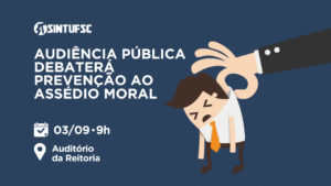 O Sintufsc convida todas/os para a Audiência Pública que debaterá a Política de Prevenção e Enfrentamento ao Assédio Moral da UFSC. A Audiência ocorrerá no dia 3 de setembro, às 9h, no Auditório da Reitoria. O evento será transmitido ao vivo pelo canal do YouTube da TV UFSC. A minuta