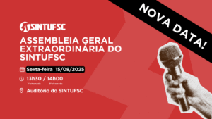 O Sindicato dos Trabalhadores em Educação da Universidade Federal de Santa Catarina – SINTUFSC, na forma estatutária, convoca os trabalhadores da Universidade Federal de Santa Catarina para participarem da Assembleia Geral Extraordinária, a ser realizada no dia 15 de agosto de 2025, sexta-feira, no Auditório do SINTUFSC, em Florianópolis, em