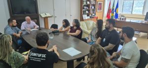 Participaram da reunião o reitor Irineu Manoel de Souza; representantes do Sintufsc na Comissão: Elaine Tavares, Matrede Oliveira, Jakeline Carbonera e Renato Ramos Milis; demais membros da comissão: Nicolle Doneda Ruzza (DAS), Douglas Kovaleski (HU); diretores do sindicato: Eduardo Garcia, Gabriela Carvalho, Guilherme Rizatti. E o secretário de comunicação da reitoria: Marcus Pessoa.