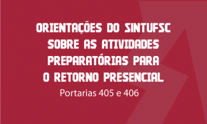 No dia 16 de agosto, a Reitoria da Universidade Federal de Santa Catarina (UFSC) publicou as portarias normativas 405 e 406 que estabeleceram prazos acerca da preparação da retomada gradual das atividades presenciais nas unidades administrativas e acadêmicas da Universidade. Na contramão desta informação foi divulgado no Notícias UFSC um texto que deu a entender … Continue lendo Orientações do SINTUFSC sobre as atividades preparatórias para o retorno presencial (Portarias 405 e 406)