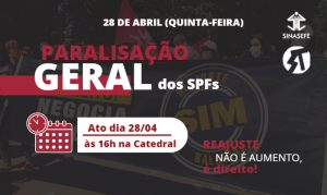 Dia 28 de abril é Dia de Paralisação Geral dos Servidores Públicos Federais em todo país pela recomposição salarial emergencial. Reajuste não é aumento, é direito! Os atos fazem parte da Jornada de Lutas que ocorre de 25 a 29 de abril pelo reajuste mínimo de 19,99%, referente a inflação dos últimos anos. O governo … Continue lendo PARALISAÇÃO GERAL DOS SERVIDORES PÚBLICOS – 28/04
