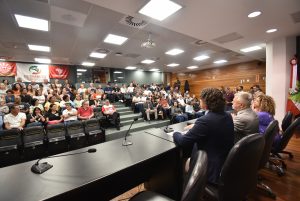 Dirigentes de mais de 20 sindicatos e entidades que representam as trabalhadoras e os trabalhadores das empresas e dos serviços públicos municipais, estaduais e federais em Santa Catarina responderam ao chamado do Fórum Catarinense, co-organizador do evento, e lotaram o Plenarinho da Assembleia durante o Lançamento.