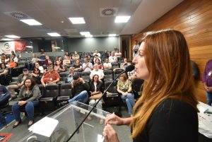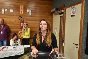 Antes dos pronunciamentos das entidades e dos mandatos, a economista do DIEESE, Tamara Siemann Lopes, apresentou a síntese do Atlas do Serviço Público em Santa Catarina, elaborado em 2021 para denunciar alguns mitos, como o “inchaço da máquina pública”, “os privilégios dos servidores” e o “Estado quebrado”.