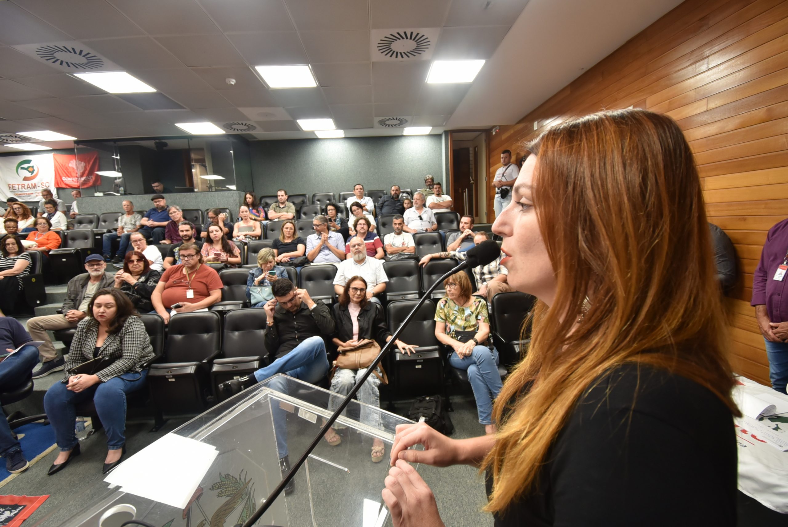 Dirigentes de mais de 20 sindicatos e entidades que representam as trabalhadoras e os trabalhadores das empresas e dos serviços públicos municipais, estaduais e federais em Santa Catarina responderam ao chamado do Fórum Catarinense, co-organizador do evento, e lotaram o Plenarinho da Assembleia durante o Lançamento.
