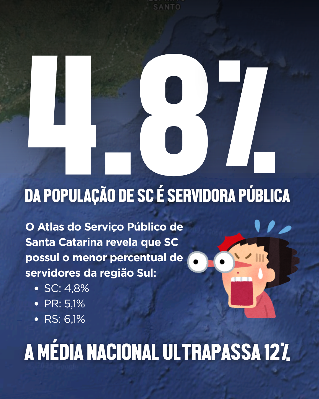 Os dados apresentados desmontam o discurso recorrente de que haveria “inchaço” na máquina pública e reforçam a necessidade de novos concursos públicos. Além de apresentar um dos menores percentuais de servidores do país, Santa Catarina é o estado da região Sul com o menor percentual de trabalhadores no serviço público. Em 2022, cerca de 4,8% da população catarinense estava empregada no setor público, número inferior ao do Paraná (5,1%) e do Rio Grande do Sul (6,1%).