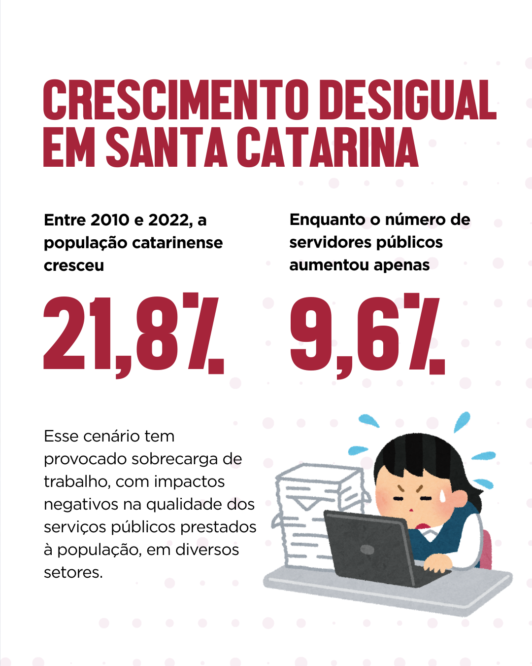 Outro aspecto preocupante apontado pelo Atlas é o descompasso entre o crescimento populacional e a expansão do quadro de servidores. Nos últimos dez anos, a população catarinense cresceu 21,8%, o que representa um acréscimo de aproximadamente 1,4 milhão de pessoas entre 2010 e 2022, enquanto o número de servidores públicos aumentou apenas 9,6% no mesmo período. Esse cenário tem provocado sobrecarga de trabalho, com impactos negativos na qualidade dos serviços públicos prestados à população, em diversos setores.