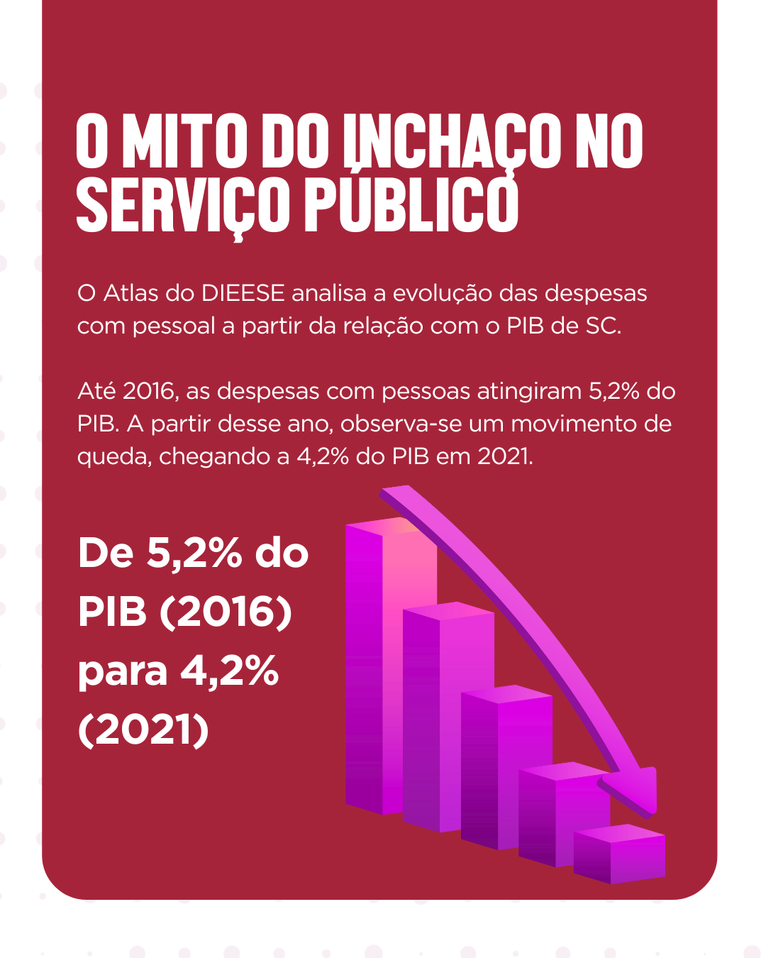 Outro fator que contribui para a precarização dos serviços públicos diz respeito à política orçamentária do estado. O Atlas do DIEESE analisa a evolução das despesas com pessoal a partir da relação com o Produto Interno Bruto (PIB) de Santa Catarina. As despesas com pessoal apresentaram trajetória ascendente até 2016, quando atingiram 5,2% do PIB. A partir desse ano, observa-se um movimento de queda, chegando a 4,2% do PIB em 2021.
