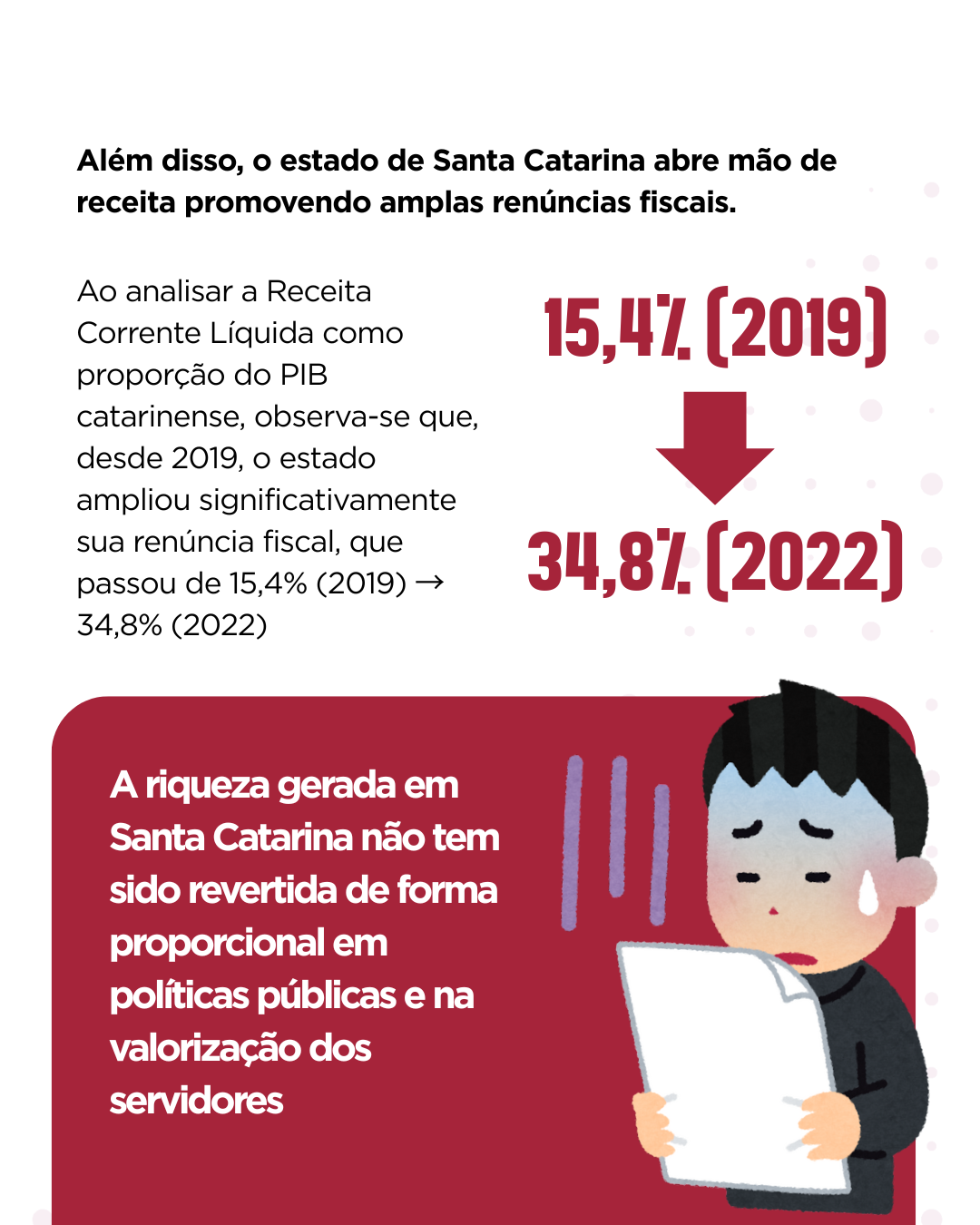A pesquisa ressalta que, nos últimos anos, o governo de Santa Catarina promoveu amplas renúncias fiscais, comprometendo a arrecadação estadual e a capacidade de investimento no serviço público. Ao analisar a Receita Corrente Líquida como proporção do PIB catarinense, observa-se que, desde 2019, o estado ampliou significativamente sua renúncia fiscal, que passou de 15,4% da receita bruta em 2019 para 34,8% em 2022.