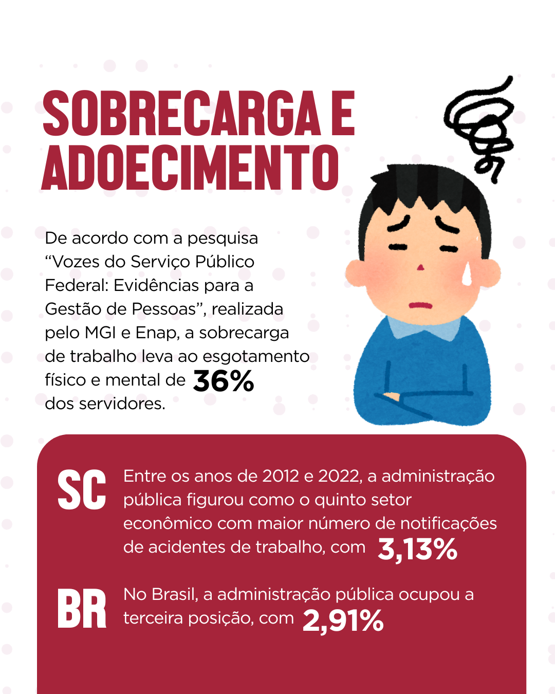 A saúde do trabalhador tem sido um tema recorrente entre os trabalhadores do serviço público, em um contexto de precarização das relações de trabalho e sucateamento da infraestrutura básica do setor público. De acordo com a pesquisa do MGI, “cerca de 36% dos servidores dizem que, em suas equipes, a sobrecarga de trabalho leva o servidor ao esgotamento físico e mental.” Além disso, 46% relatam que os servidores com melhor desempenho acabam sendo os mais sobrecarregados.