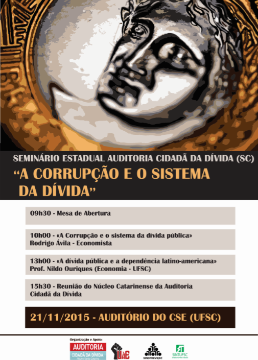 Acatando deliberação tirada durante a greve da categoria, o SINTUFSC está apoiando a realização, na manhã do próximo sábado (21/11), de um seminário estadual para aprofundar a discussão sobre a dívida pública. O evento tem inscrições gratuitas e acontece no auditório do Centro Sócio Econômico (CSE) no campus da Trindade, com início previsto para as 9h30.